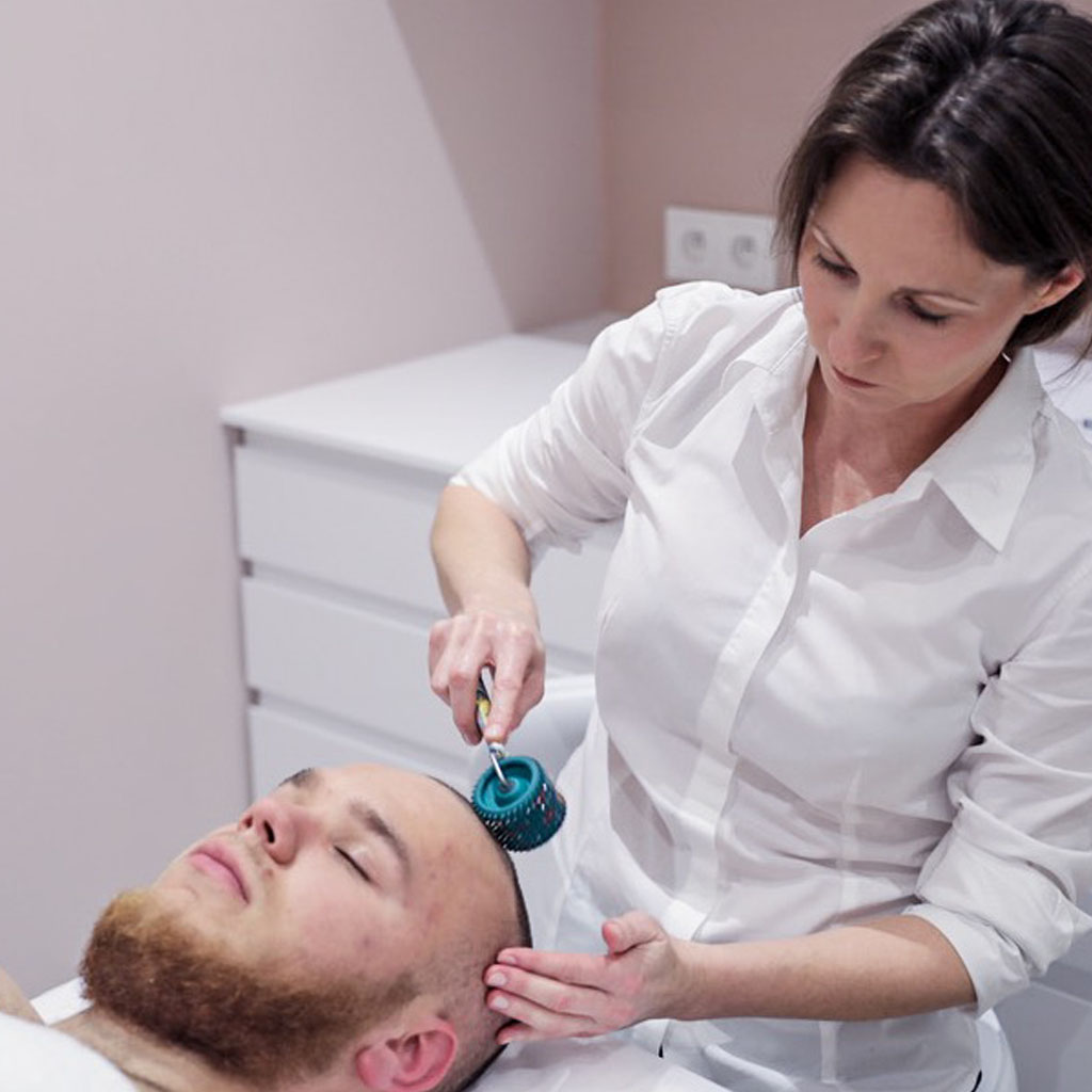Ważnym elementem rehabilitacji jest również aplikator wieloigłowy, który pozwala na wielokrotne nakłuwanie skóry głowy bez przerywania ciągłości tkanki. W ten sposób specjalista wykonuje mikromasaż skóry i położonych pod nią tkanek, co przyspiesza regenerację i odrost włosów. Masaż ma na celu również rozluźnienie mięśni w okolicach głowy, szyi oraz odcinka szyjnego kręgosłupa.